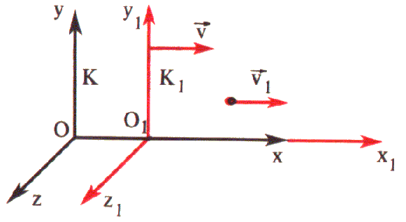Formularemos a lei da composição das velocidades para o caso particular em que o corpo se movimenta ao longo do eixo X1 do sistema de referência K1 , o qual, por sua vez, se move com a velocidade v em relação ao sistema de referência K. Além disso, os eixos das coordenadas X e X1 coincidem sempre, enquanto os eixos das coordenadas Y e Y1 , Z e Z1 se mantêm paralelos (fig. 4) .