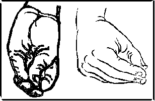 The elbows are into the ribs and the forearms are parallel to the ground, the hands are palms up with the fingers pointing up 120 degrees apart (about three feet)