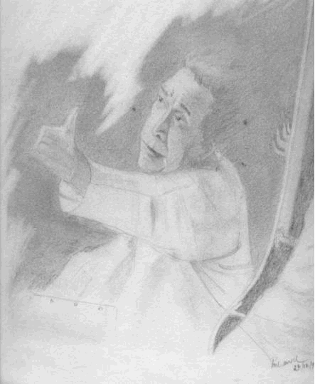 Pencil sketch of this great artist is reproduced from the sketch pad of the author.