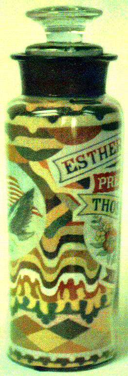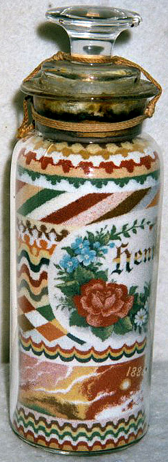 An early sandbottle. Front: "FILLED BY / A. CLEMENS / A DEAF MUTE / OF / McGREGOR, IOWA". Back: Geometric. |
