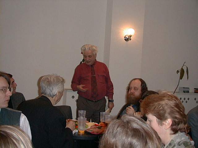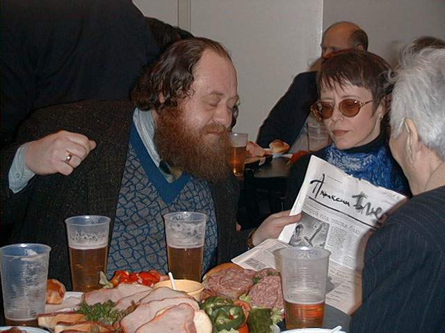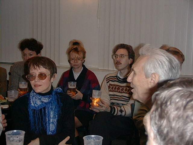 Чтение переводов из китайской поэзии на презентации в издательстве "Петербургское востоковедение" 2. На той же презентации -- Лев Николаевич Меньшиков, мой учитель 3 -- 4. Там же. Моя жена Яна и мой учитель Евгений Александрович Серебряков (я передаю ему газету)