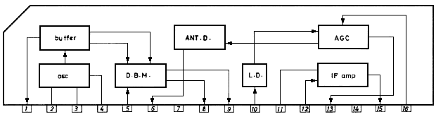 &127; Double-balanced type MIX, PIN diode drive AGC output, MOS FET gate drive AGC output, keyed AGC, differential IF amplifier, buffer amplifier for oscillation, local oscillation.
