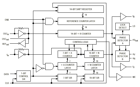 This output generates a signal by the onchip control logic circuitry for controlling an external dualmodulus prescaler. The MC level is low at the beginning of a count cycle and remains low until the ÷ A counter has counted down from its programmed value. At this time, MC goes high and remains high until the ÷ N counter has counted the rest of the way down from its programmed value (N A additional counts since both ÷ N and ÷ A are counting down during the first por-tion of the cycle). MC is then set back low, the counters pre-set to their respective programmed values, and the above sequence repeated. This provides for a total programmable divide value (N T ) = N