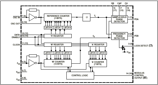14 | MC | Modulus control output for controlling an external dual-modulus prescaler. MC will be low at the beginning