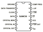 The NJ88C30 contains all the logic needed for a VHF PLL synthesiser and is fabricated on the GPS highper formance, small geometry CMOSprocess.The circuit contains a referenceoscillator and divider, a two-modulus prescaler and 4-bit control register, a 12-bit programmable divider, a phase comparator and the necessary data input and control logic.