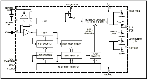 The programmable divider consists of a 415/16 two modulus prescaler with a 4-bit control register, followed by a 12-bit programmable divider. A 1V RMS sinewave should be capacitively coupled from the VCO to the divider input VCO pin (pin 10).