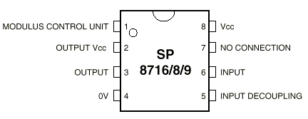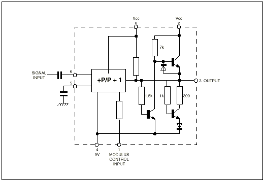 The signal (clock) inputs are biased internally and require to be capacitor coupled. The output stage is of an unusual low power design featuring dynamic pull-up, and optimised for driving CMOS. The 0 to 1 output edge should be used to give the best loop delay performance.