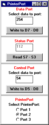 Visual Basic: In Visual Basic you have to use a DLL to access the ports. Jan Axelson programmed two DLLs which allow you to use the Visual basic 16-bit and 32-bit . You can download the DLLs at Inpout16.DLL and Inpout32.DLL. Although the program code to call the Inp and Out routines. You can also download our examples PrinterPort for Visual Basic 3.0: PRINT16.ZIP You can also download our examples PrinterPort for Visual Basic 5.0: PRINT32.ZIP Instructions to read and write to the port: read instruction:xx=INP(address) write insruction:OUT(address),xx You can write to the data port(D0-D7) at the base address. D0 is the least significant bit and D7 is the most significant bit. For example "OUT(889),85" writes 01010101(=85 decimal)to the port address 378h (= 889 decimal). You can read the status port(S3-S7) at the base address+1. At Bit 7(S7) you will read the inverted signal of the connector. S0 - S2 are usually not in use and read as low signals. When all signals are high you will read 78h (01111000 = 120decimal = 78h). You can write to the control port(C0-C3) at base address+2. The bits 0,1 and 3 are inverted so if you write 04h (00000100), all four bits will be going high and when you write 0Bh (00001011) all four bits will be going low. |