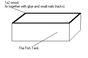 First, get some thin wood (1"x2" is what I used). You then make a frame that fits all the way around the top of the tank, WITHOUT poking out over the outside edge more than 1mm. To this you fit a load of pine skirting UPSIDE DOWN. This results in a small recessed lip that you can fit some hardboard to. Use mitred corners for a good looking result. Make sure you varnish it all with several coats of polyurethane varnish, to stop it warping and possibly crushing the glass of your tank...