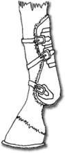A shipping wrap, also called a travel or trailer wrap, is designed to protect a horse during trailering. For a travel wrap, you will need tall quilts that extend from the knee to the coronary band and a wide, long bandage. Start with the edge of the quilt on the inside of the cannon. Wrap the quilt around the leg, keeping it snug and low on the leg. Fasten the hook-and-loop closures that will hold the quilt in place while you begin wrapping. Begin about midway and apply the bandage in the same direction as you did the quilt. Because you are wrapping over a thicker quilt and a longer area, if you are using a 4" x 9' bandage you will have to use it very efficiently or there will not be enough to finish. A 6" x 12' bandage would be better. Wrap down to the coronary band, leaving some quilt extending out the bottom. Wrap back upward. Since the quilts are very thick, you can apply quite a bit of tension as you wrap. If you don't, you will probably find the bandage on the trailer floor. Finish at the top and tie, tucking the ties in. An alternative to traveling wraps is heavy nylon traveling boots. To offer extra protection if a horse were to step up onto the bulbs of the heels with a hind hoof, the bottom of these boots is reinforced with a heavy plastic scuff plate. There are also shipping boots which have Kevlar sewn to the bottom. Kevlar is the material used in bulletproof vests, so it will withstand the abuse from the other hooves.