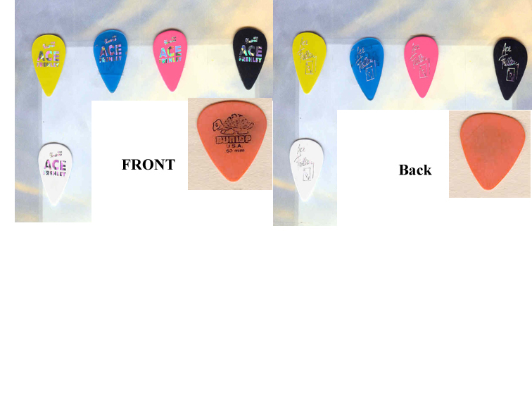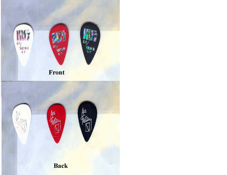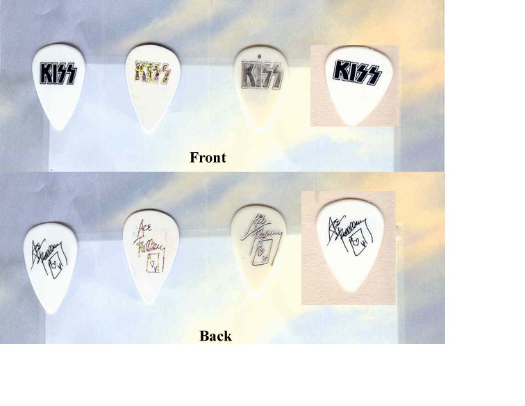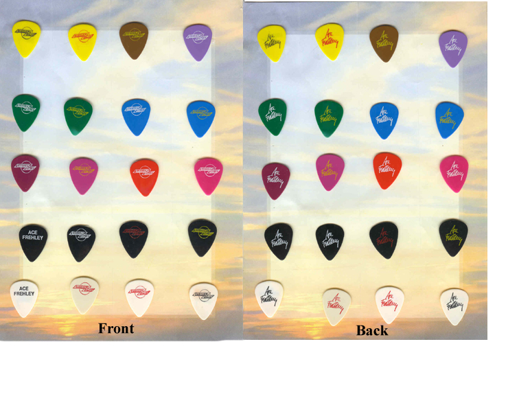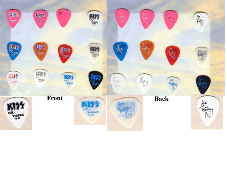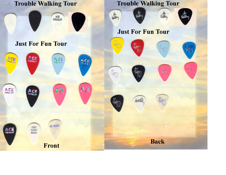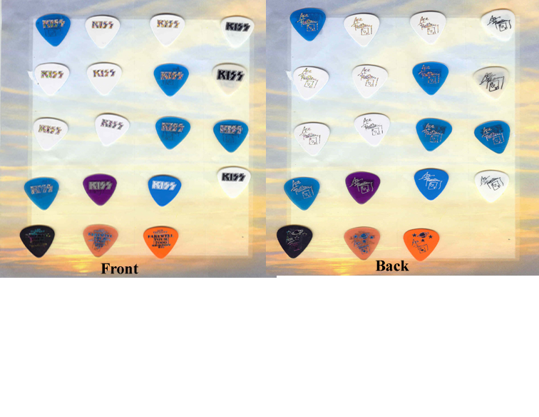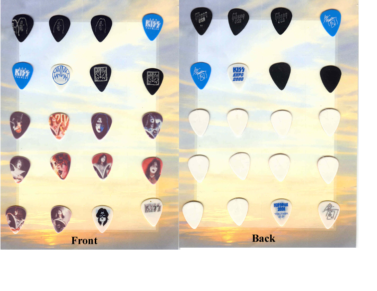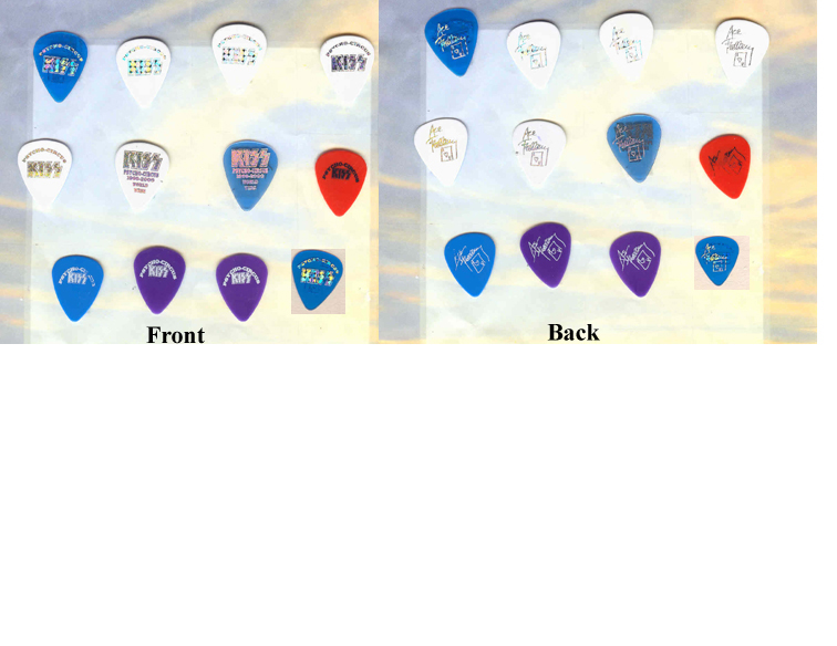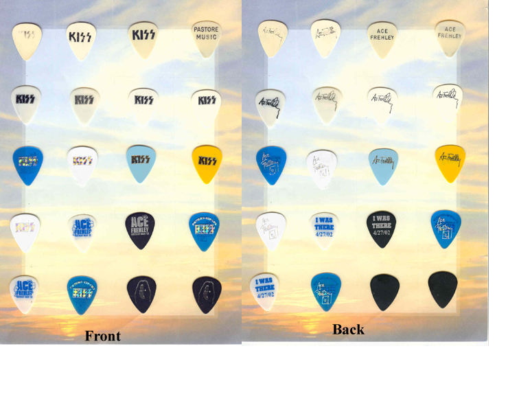 If you wanna see the Picks up close then click on thePicture!Page 1,2 AND 3-1970-1980 Kiss Tour and other special events.Page 4 and 5-Frehley's CometPage 6-Trouble Walking Tour and Just for Fun TourPage7-Bad Boys TourPage8-Alive WorldWide 96-97 Tour Picks and Page9-Alive WorldWide Phone Card PicksPage10- 12 Picks and Loaded Deck Promo PicksPage11-Psycho CircusPage12-Farewell TourFarewell City Picks Pages