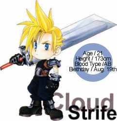 JOB: Mercenary (ex-Memeber of SOLDIER) AGE: 21 WEAPON: Sword HEIGHT: 5'7" BIRTHDATE: August 19 BIRTHPLACE: Nibelheim BLOOD TYPE: AB |