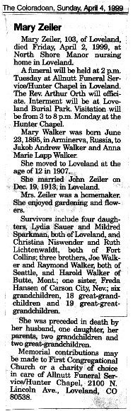 Survivors are six daughters; Mrs Ruth Holland of Gruver, Texas; Mrs Marie (Karel) Birdsall of Kirkland, Wash.; Mrs. Frieda (Marion) Peterson of Munich, Germany; Mrs Emma Lindberg of Santa Fe, New Mexico; Mrs Mollie Parsons of Los Angeles, Calif.; Mrs Helen Lockee of Seattle, Wash.; and four sons, Henry of Gill; Jacob of Wiggins; John of Holyoke; and George of Kersey; two sisters, Marian and Katherine both of Denver; 30 grandchildren, 50 great-grandchildren and 6 great-great-grandchildren.