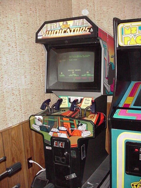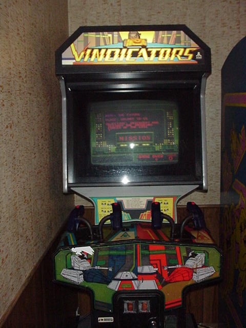 VINDICATORS A cool two player tank game. The cabinet is in good shape. The monitor is a little dull and the glass in front of the monitor is scratched. One of the fire buttons has been soldered so that it always fires. I will have to find a new button. Fun game to play. Mortal Kombat This is my JAMMA cabinet project. The cabinet is in great shape. The marque and bezel look really good. The control panel overlay should be replaced. The Mortal Kombat board is intact but I don't know if it works. The power supply is missing. I tried to order a power supply from Arcadestick.com but they did not reply to my request for information on how to order it. I intend to install a multi-jamma board form multigame.com. This board will allow me to install up to 8 JAMMA boards into one cabinet. Big Choice Claw Machine Non working crane game. The boards are loose inside and the power supply is missing. I have no idea where to find parts. I found a working one on ebay and I think it sold for about $400. Rockola/Techna 1981 I have to double check it might be a 1979. It holds 80 45s for a total of 160 songs. I need to get a new needle but it plays. Looks really nice when it is light up. I still need to buy few more records. I know it is not an arcade machine but it is part of the game room. It really helps set the 80s mood. Madonna anyone? Tomb Raider This is my favorite machine. Why? Cause I built it. See my Tomb Raider Project page here. It plays MAME, Sega, and SNES games.