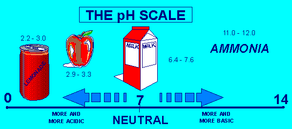 The pH of a substance is a measurement (color change or number change) of how much acid or base a substance may contain. Many acids and bases are important to the internal chemical reactions that take place in living things. Most living things attempt to keep themselves at equilibrium (neutral), but this is sometimes very difficult due to the pH of the surrounding environment. As you can see from the picture above, the pH scale (the measure of acids and bases) ranges from 0 to 14, with 7 being the middle or neutral point. A substance with a pH of less than 7 is acidic and if it greater than 7 it is basic, also called alkaline. Each time there is a change in pH of one unit, it is the same as multiplying ten times (increase or decrease) the strength of the acid or base. Litmus paper is one way to measure the strength of an acid or base substance. Other ways include, electronic pH meters and test kits that will measure acids and bases by comparing color scales. Check the web site's below for more information.