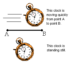 As you can see, we have two clocks. One is moving rapidly from point A to point B and the other is at rest. Either of these clocks can be used to measure the time it takes the first clock to travel from point A to point B. However, the two clocks will give different results. We can think of it this way. The two events we're talking about are the clock leaving point A, and the clock arriving at point B. In our frame (the frame of the lower clock which is at rest), these events take place at different points (A and B). However, let's look at this from the reference frame of the upper clock. From this point of view, the upper clock is at rest (anything is at rest from its own point of view) and the line containing the points A and B is rushing by from right to left. So, the two events, the departure of point A and the arrival of point B, both take place at the same point: the point where the clock sits! (The time measured by the upper clock is called the "proper time".) By the principle stated above, the lower clock will record a longer time than the upper clock as the upper clock moves from point A to point B.