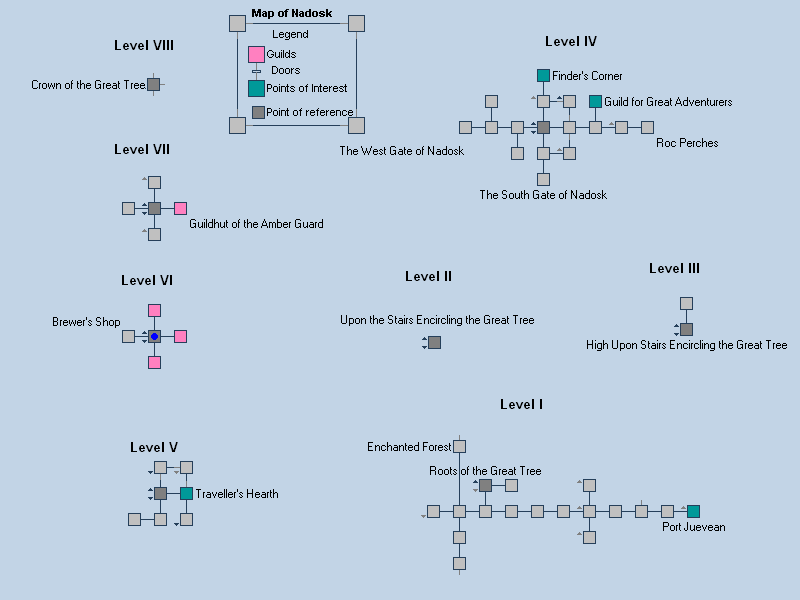 Welcome to Nadosk, the Halfling tree city. The reference room on each level will bring you up or down to the next level, as the Halfling City is built upon a great tree. The city of Nadosk can be found on the continent of Juevean. Rumour has it that there may be more than one way to cross the continents, but many new players take the boats. To read about the different points of interest, hover your mouse over the colored squares.