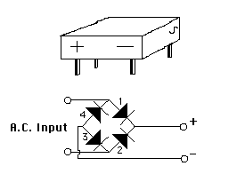Diodes Where larger currents are involved, a larger junction is needed to dissipate the heat generated. A small junction would be in danger of literally melting with currents in excess of a few hundred milli-amps. Since the power diode has a large junction, it is not suited to high frequency applications. (High frequency, high current diodes are available, but the cost is substantial.) One advantage of the larger junction is its ability to withstand higher voltages without sustaining damage. While a signal diode may only be able to take 30 to 50 volts reverse potential, it is quite common to find power diodes rated up to several thousand volts maximum reverse bias. (Termed "Peak Inverse Voltage", or PIV.) Power diodes are able to pass large loads varying from the 1N400X series rated at 1 amp up to industrial diodes capable of carrying hundreds of amps! These diodes come in a variety of encapsulations, the most common being a black cylinder of plastic about 3mm across with a white band indicating the cathode (negative) end. Large-current devices are often encased in metal to provide efficient heat transfer. It is possible to purchase a 'pack' of four power diodes arranged in a full-wave bridge configuration. (See the section on power supplies.) The physical construction of bridge depends again on the current demand, but all have four leads; two for A.C. input and one each for positive and negative output.