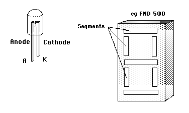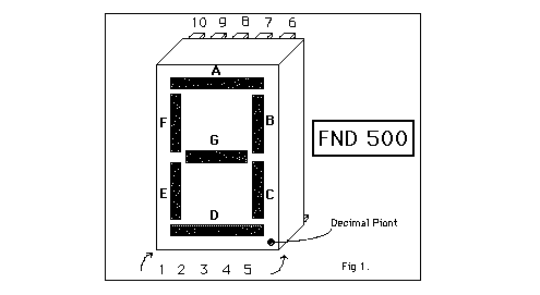 Electrons flow from the emitter to the base region, but since the base is so thin, most diffuse into the collector. While this region is reverse biased for holes, it is forward biased for the electrons which have just arrived. The light doping of the collector prevents too high a degree of repulsion between the electrons in the collector and those which arrive from the emitter. (via the base) The small base current 'removes' any electrons in the base region which would otherwise tend to block the flow of current from the emitter. As the collector-base junction is reverse biased (for majority carriers), the collector supply voltage may be considerably larger than the base-emitter junction voltage. This allows a large 'load' resistor to be connected in series with the collector as shown. (Rc above) In other words, the low resistance of the base-emitter junction has been transferred to a higher resistance in the collector circuit. (ie "Transistor") The same principles apply for PNP transistors, but the charges on the majority and minority carriers are opposite. Seven Segment Display A "seven segment display" consists of seven separate segments, made up of LEDs, Fluorescent tubes, or magnetic panels (on some petrol bowsers) which can be individually activated to display digits. One of the most common electronic versions of such displays is made up of seven rectangular LEDs moulded together into a single digit 'block'. One leg of each individual LED connects to a pin at the rear of the device and the second legs are all connected together as a single "common" pin. Depending upon which arrangement is used, the display is described as "common cathode", or "common anode". The FND 500 is a "common cathode" display.