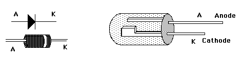 which indicates that this capacitor has a capacitance of 100 micro-farads and a breakdown voltage of 25 volts. (approximately) Smaller capacitors, such as 'greencaps' use a numerical system where the first place represents the first digit, the second place; the second digit and the third place is the number of zeros. (the multiplier) The capacitance so indicated is in picofarads! 104 K = 100,000pF or 0.1uF Colour codes follow a similar pattern to that used for resistors, but they tend to become rather confusing at times. A good set of 'data' sheets should be consulted when decoding is needed. DIODES Diodes are the simplest of solid-state devices. They consist of a piece of P-type material fused to a piece of N-type material. The most common forms of diodes are constructed from Silicon, with Germanium reserved for those special applications where a low forward bias is essential. As outlined later in the section on the "P-N junction", the diode will only conduct in one direction, with electrons flowing from the N-type end to the P-type end. If a voltage is applied which reverse biases the junction, the depletion layer will widen until a point is reached where the voltage exceeds the 'breakdown' voltage of the diode and large currents flow; destroying the device. (One type of diode, the 'zener', actually makes use of breakdown voltage in an interesting way.) There are many different forms of diodes, from simple 'point-contact' signal diodes to multi-coloured light emitting diodes. A few of the more common varieties are discussed below. Signal Diodes Signal diodes are physically small devices usually used where small currents and high frequencies are involved. As will be discussed in the section on 'vari-caps', the size of the junction has an effect on the signal capabilities of the diode. A small junction offers less resistance to high frequencies than does a wide thick junction. As the name implies, these diodes are to be found in the 'signal' section of radios and televisions. ( This role is being phased out by I.C. detectors.) Signal diodes are very small and often glass encapsulated, with a red or black band on one end. (The glass is sometimes painted over to reduce unwanted photo-voltaic effects.