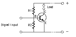 The 'tap' is controlled by varying the voltage between the emitter and base of the transistor. The main 'flow' is a path between the emitter and the collector. As outlined later, in the section on the 'Bi-polar' transistor, in order to turn on the emitter-collector pathway, a forward bias of at least 0.6 volts is needed between the emitter and base. In a PNP type, this means the base bust be at least 0.6 volts 'more negative' than the emitter and in a PNP type, the base must be at least 0.6 volts 'more positive'. The actual base current is chosen in order to provide a 'linear' response to the applied signal. (i.e. the amplified signal is proportional to the changing base current). Biasing Transistors: To keep the transistor operating within this useful range, resistors are used to establish a predetermined potential difference between emitter and base and base and collector. These resistors are called 'bias' resistors. There are a variety of ways to provide the correct 'bias' to a transistor, one of the most common is presented below: