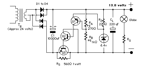 Regulated Power Supply - HOW IT WORKS: If the output voltage increases, the voltage at the junction of RA and RB also increases. In other words, the voltage at the base of Q1 rises. This tends to turn off Q1 which turns off Q2 and Q3. (Reduces the current, rather than turning them off completely.) The opposite occurs if the voltage tends to drop off. A constant voltage is therefore maintained at the output of the supply. In practice, RA would be adjustable, in order to set the output exactly. RS - provides a 'starting load' for the supply. A voltage must appear at the base of Q1 before the circuit will operate. RS allows current to flow at 'switch on' and to establish the necessary potentials around the circuit. (For a very small load, RS may be reduce in value.) CL - provides improved stabilisation. i.e. ripple is further reduced. RG and Globe - prevents the generation of excessive voltage at the output when loads are very small. If Q3 switches off under light loading, the current flowing through RS could allow the output to rise to the voltage at the output of C1 and C2. The small current flowing through the globe prevents this from happening. (RS is chosen to limit the current through the globe to 'safe' levels.) RZ - limits the current passing through the zener. C1 - provides a degree of 'smoothing'- about 10,000uf total is adequate. D1 - D4 - rectify the transformer output. TR - mains transformer with about 20 volts output.