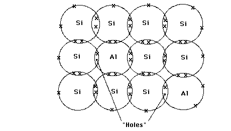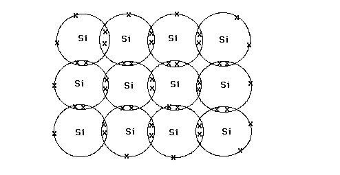 CHOOSING THE TRANSISTORS: The choice of Q1, Q2 and Q3 is an interesting exercise in itself. You must work 'backwards' from Q3. The most economical choice for Q3 would be a 2N3055. This transistor can pass up to 15 amps and is easily bolted directly to the case. (Without the use of an insulating washer!) The required output voltage is also well within the specifications for this transistor. Having selected Q3, we must determine its optimum base current . (Data tables need to be consulted.) Q2 is selected according to its ability to deliver this base current to Q3, keeping in mind the current available from Q1 and the gain of Q2. Q1 is then selected according to the base current needed by Q2, keeping in mind the gain of Q1 and current available from RA. This may seem complex at first, but in reality it is very simple. The complication arises because we must consider the current needed by the following transistor, while working out the base current and gain of the preceding transistor. Say for example that Q3 requires a base current of 100mA. Q2 must deliver this current having 'amplified' its own base current. We therefore need to know the gain of Q2 and the current available from Q1. The base current of Q1 is determined by the value of RA and RB. A small signal transistor such as a BC558 has a gain of several hundred, so even a few milliamps at its base will provide tens of milliamps at the base of Q2. It is therefore not all that important to know the exact base current of Q1, as long as a high gain transistor is used. Perhaps more important is the choice of Q2. This transistor must be able to provide sufficient gain and power handling to 'amplify' tens of milliamps into the hundred, or so needed by Q3. A typical choice would be a BD139. The preceding was presented for two reasons. Firstly to provide an insight into the theory of power supplies and secondly (and most importantly) to try to show that electronic design is demanding, but by no means impossible. With a good set of data tables and an understanding of basic transistor theory such as 'gain' and 'base current' anyone could select suitable replacement for Q1, Q2 and Q3. (Give it a go!) SOLID STATE THEORY P-type and N-type Material: Electricity travels through substances when electrons move from place to place within the substance. Elements which have outer electrons held less tightly than inner ones may have a number of "free electrons" which are able to move around and take part in this process. Substances such as Silicon have some "free electrons", but not as many as a substance such as copper. By adding certain 'impurities' to crystals of silicon, or Germanium, more free electrons (Carriers) may be liberated. The diagram below represents the structure of a 'normal' pure crystals of Silicon. (Only outermost electron are shown.) Notice that each atom shares eight electrons. Under these circumstances, all electrons are bound strongly to the nucleus, leaving few "free electrons" in the crystal.