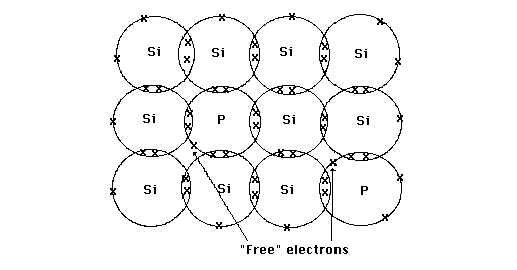 If a few atoms of phosphorus are added to the crystal, unpaired electrons are now free to move within the crystal structure. The process of adding selected 'impurities' to Silicon is termed "Doping".