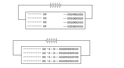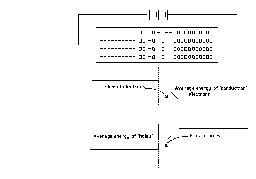 In this case, spaces, or 'holes' exist where electrons could exist. Electrons can move from one end of the crystal to the other by 'jumping' from hole to hole. (It could in fact be imagined that the 'hole' is moving in the opposite direction!) As the above two examples illustrate, conduction through 'doped' Silicon differs. In one case, conduction is by electron flow and the other by 'hole' flow. (This is not just a case of semantics, there are measurable differences between the two!) Materials which conduct by electron movements are called: N-type. Materials which conduct by 'hole' movement are called: P-type THE