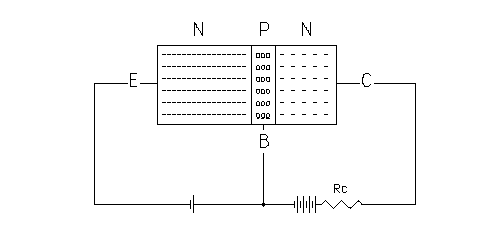 As can be seen from the diagrams; when forward biased, majority carriers from each side will readily flow 'downhill' to a lower energy state across the junction. Minority carriers, on the other hand see the junction as a 'hill' and will not readily flow to the higher energy state. The small current which does flow is called: 'leakage current'. When three pieces of semiconductor material are fused together, the situation becomes slightly more complex, but the same basic 'diode' principles apply. The bi-polar transistor is constructed with a heavily doped emitter, a very thin base and a lightly doped collector.
