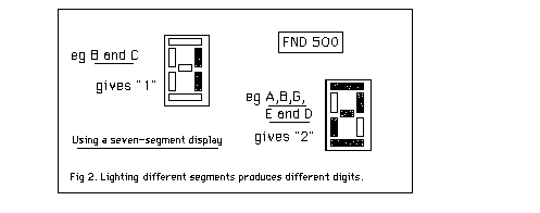 Numerals are produced by arranging LEDs in a seven-segment arrangement as outlined below. I.C.s are available for "driving' displays directly. (The 4026 for example, will take pulses, count them and display the count on a seven-segment display, all for a few dollars!) A LED may be thought of as a 1.5 volt globe for design purposes. If voltages of more than this are involved, a 'dropping' resistor is needed, as indicated below.