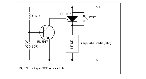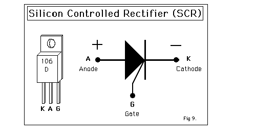 The SCR is a high-current, high-voltage solid state switch. A typical SCR, such as the C106D is rated up to 400 volts at 4 amps! Only a few milli-amps between the "Gate" and "Anode" will "trigger" the SCR, which will continue to conduct until the voltage across A-K is removed (or reversed). For low voltages, a "shorting switch" across A-K will stop conduction (ie turn it off!) In the case of an AC supply, this resetting action will occur each time the cycle changes. The SCR will therefore only continue to conduct AC while the Gate current is present. The SCR is very easy to trigger, but usually