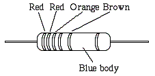 Resistance Values: On 5% resistors (that don't have a blue body) the first two bands represent the first two digits in the number. The third band represents the "multiplier" i.e. the number of zeros to be added after the first two numbers. The value is in 'ohms'. e.g. 1