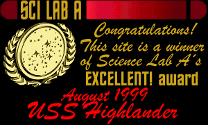 Congratultaions, Tony Noble! Your site, USS Highlander has won the EXCELLENT! award for August 1999. You won over your contestor by over a horsehead nebula! :) I must say I'm impressed with your site, but keep up the good work anyway!