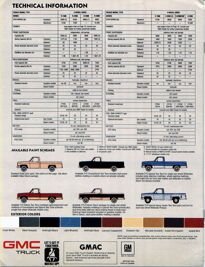 The following is the general technical information for my truck such as brakes, suspension, tires, etc. Also included is the different available paint schemes and colors. My truck was originally Steel Gray, but for a reason unknown to me the original owner repainted it the black color that it is today.