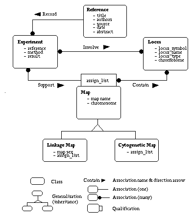 As a map represents order and distance among loci along a chromosome, the basic attributes of a map should include: the map name, the chromosome, a list of mapping points (or assignments) each of which references the locus and its position. The map concept can be further specialized, e.g. a cytogenetic (i.e. physical) map and a linkage (i.e. genetic) map. The basic attributes of a locus include its symbol, name and type. An experiment can be described by the method used and results observed. A reference can be defined by the title, authors, source, date and abstract.