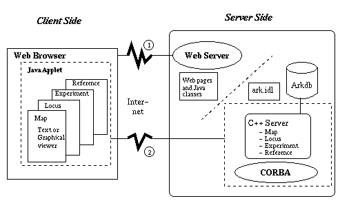 A system prototype has been implemented using an evaluation copy of Visigenic's CORBA software: VisiBroker for C++ (Orbeline) 2.0 Release 1.51 and VisiBroker for Java 1.2. They provide CORBA applications development environments for C++ and Java, respectively. Our ArkDB genome databases serves as the data source. The implementation work includes IDL file design based on the conceptual model, server side object implementation which mainly deals with database connectivity and mapping from relational data to CORBA objects, and creating a client side graphical gene map viewer. The system architecture is illustrated in Figure 4.