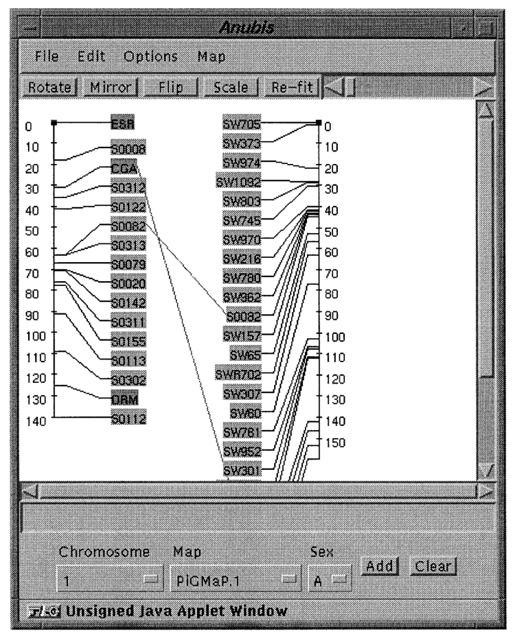 The user can select one of these names via a pop-up menu, along with chromosome and map sex. When the user has selected these parameters, and clicks on `Add map', the next CORBA operation is to fetch the map requested.