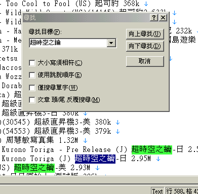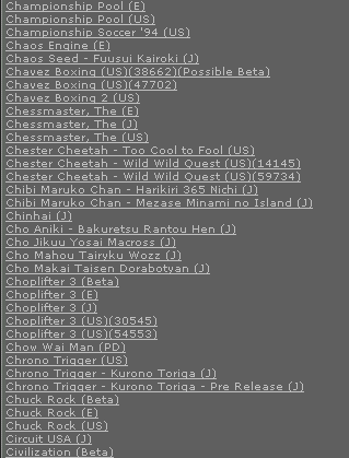 首先玩家必須連結到PE2000這個網站,是個英文的網站,然後玩家會在畫面的左上方看到【ROM】的字樣。 點選【ROM】字樣進入之後,會看到下面的畫面。 這是注意事項的同意書,按下【Continue】之後進入下一個畫面。 玩家會在畫面的右方看到這四個分類,由上而下分別是【家用主機】、【大型電玩】、【掌上型電玩】、【電腦遊戲】,玩家選擇【Console家用主機】進入下一個畫面。 這就是PE2000網站所有的【家用主機】ROM,在這裡小弟介紹超任的部分,如果玩家有需要的話請自行看看。點選【SuperNES】進入超任遊戲的下載頁面如下。 玩家會看到畫面出現字母排列,由於是國外網站的關係,所以是依照英文名稱的首個字母來排列的,如果玩家知道該遊戲的英文名稱時,可以直接進去找,如果不知道的話,可以利用超任全部遊戲的英文中文對照表來尋找,在這裡提供大家一個方便的技巧,那就是文件搜尋的技巧,在網頁或是文件裡頭按下【Ctrl+F】會跳出一個搜尋的方塊,這樣一來就可以快速的找到自己想要找的遊戲。小弟拿下載【超時空之鑰ChronoTrigger】來當個例子,首先打開超任全部遊戲的英文中文對照表,按下【Ctrl+F】打入【超時空之鑰】,畫面上就會直接跳到【超時空之鑰】所在的地點。 玩家可以看到【超時空之鑰】的英文名稱為【ChronoTrigger】接著到上面遊戲開頭字母的那個畫面,按下【C】的字母,便會跳出下面的畫面。 實在是眼花撩亂不是?但是這時候只要利用【Ctrl+F】蒐循的技巧來找就可以很快的找到【ChronoTrigger】,按下去之後會跳出來下面畫面。 這時候已經在進行中,玩家大概要等一小段時間,就會有下載的畫面跳出。 然後就可以進行下載的動作,其他的遊戲以此方法類推,希望大家能下載的盡興!