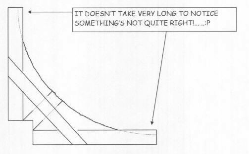 YOU MAY HAVE NOTICED THAT WHAT YOU HAVE NOW IS KINDA WIMPY...PLYWOOD DOESN’T HOLD UP VERY WELL ON IT’S OWN..ESPECIALLY AT THE TIPS OF THE CURVE WHERE THE PLYWOOD IS THINNEST. SO AGAIN, THE 2 BY 6’S COME TO THE RESCUE.