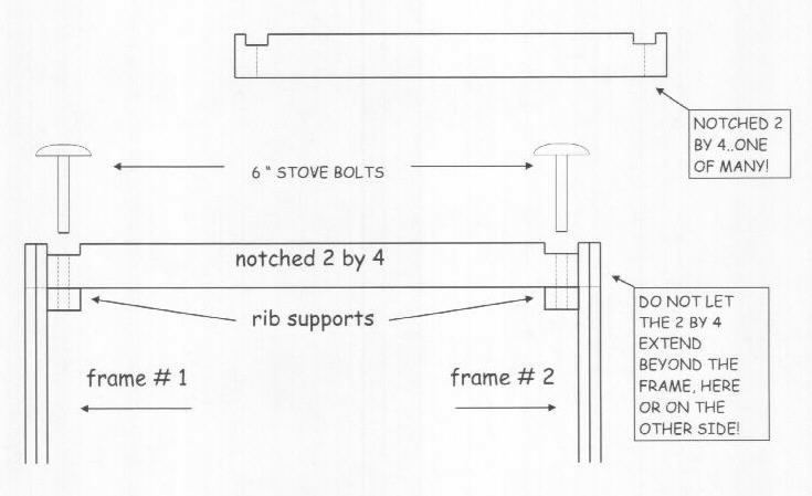 OK. THIS GETS A LITTLE TRICKY..DEPENDS WHAT YOU WANT TO DO.. THE "RIBS" ARE THE CROSS MEMBERS ( 2 BY 4’S) WHICH CONNECT ONE FRAME PIECE TO ANOTHER, CREATING THE "SECTION" .HERE’S WHERE I CUT YOU SOME SLACK..IF YOU’RE GONNA MAKE THIS THING MODULAR, STAY TUNED, HOWEVER, IF YOU’RE MAKING IT PERMANENT YOU CAN USE THE 12 FOOT 2 BY 4’S AND, WHEN YOU’RE DONE WITH ALL SIX SECTIONS, JUST SCREW, NAIL OR WHATEVER (HIGHLY RECOMMEND BOLTS!) THEM RIGHT TO THE RIB SUPPORTS. IF YOU’RE MAKING IT MODULAR, HOWEVER...HE HE..OK...WHAT YOU NEED TO DO NOW IS CUT 6 OF THOSE 8 FOOT 2 BY 4’S IN HALF MAKE THEM EXACTLY (!!) 4 FEET LONG, AND CUT 3 OFTHOSE 8 FOOTERS TO MAKE 6 EXACTLY 43 1/2" LONG...(MORE LATER)