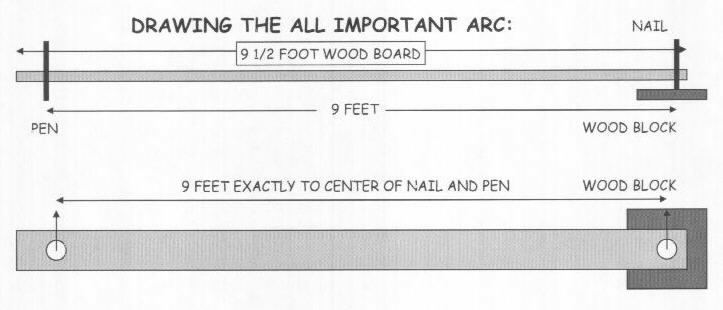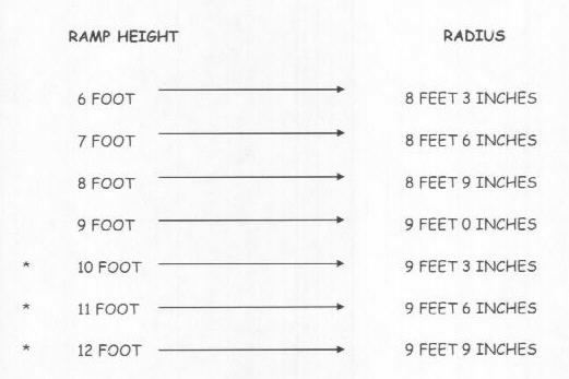 DO NOT USE STRING!! STRING CAN STRETCH AND DISTORT THE CURVE!! THE PEN AND NAIL MUST BE TIGHT SO THEY DONT MOVE WHEN YOU’R E DRAWING THE CURVE ..STRING WILL NOT ALLOW THIS. ..THESE PLANS ARE FOR A 9 FOOT HIGH HALFPIPE, BUT YOU CAN USE THE PLANS FOR ANY SIZE, FROM 5 FEET TO 9 FEET. THERE’S A LITTLE KNOWN FORMULA IN RAMP BUILDING, FOR PROPER TRANSITION, AND IT GOES LIKE THIS: