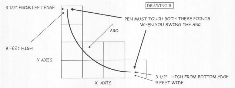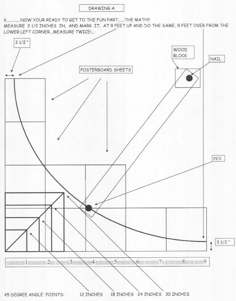 WHEN IT IS 3 1/2 " INCHES IN AT BOTH POINTS, YOU HAVE A CENTERED ARC. NOW DRAW THE ARC, AND GO OVER IT A FEW TIMES TO RULE OUT ANY MOVEMENT OF THE PEN. MEASURE A 45 DEGREE ANGLE FROM THE LOWER LEFT CORNER TO THE RADIUS EDGE..THIS IS DONE WITH SIMPLE MATH OR A (REAL!) LARGE PROTRACTOR..FOR THE MATH, MEASURE 12" HIGH, 12" LONG, FROM THE LEFT CORNER , 18" HIGH, 18 " LONG FROM THE LEFT CORNER AND SO ON TILL U GET CLOSE TO THE RADIUS EDGE; (SEE DRAWING A ) USE A SQUARE.. DRAW A LINE, CONNECTING ALL THE POINTS..BE EXACT.. IF THEY DON’T CONNECT, YOU NEED TO DO IT OVER...IF THE ANGLE ISN’T RIGHT, IT WILL WRECK THE CURVE. NOW CAREFULLY CUT THE TEMPLATE OUT....FIRST CUT THE ARC AND THEN CUT ALONG THE 45 DEGREE ANGLE LINE... THE 2 HALVES ARE PLACED OPPOSING EACH OTHER ON YOUR 3/4" PLYWOOD (THIS IS WHY YOU CAN’T DRAW THE ARC ON THE PLYWOOD) SO YOU GET 2 PIECES PER 1 SHEET OF PLYWOOD...MINIMUM WASTE.