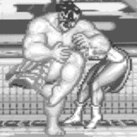 (名・動スル)ダルシム(Dhalsim)が春麗(Chun-Li)に対して至近距離でヨガファイアーを撃ったときのグラフィックの一つ。《ストリートファイターII》