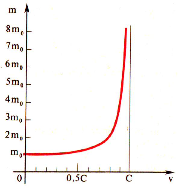 À medida que aumenta a velocidade, a massa do corpo, definida pelas suas propriedades inerciais, aumenta. Quando v ® c, a massa do corpo, de acordo com a equação ( 6 ) cresce ilimitadamente ( m ® ¥ ) ; por isso, a aceleração tenda para zero, e a velocidade praticamente deixa de aumentar, por mais que se prolongue a ação da força.