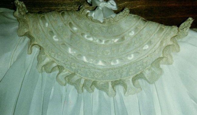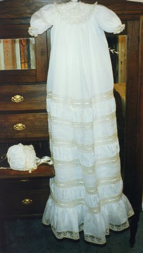 The round yoke on this gown is made up of cotton lace insertions and lace beading with ribbon. The unusually long skirt is accented with alternating bands of lace insertions, puffing and pin tucks. The sleeves are attached to the slip with entredeux. Click on the image for a close-up view of the yoke details.