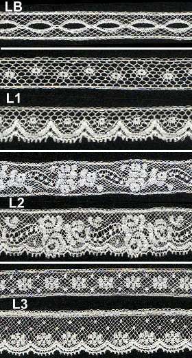 Standard colors : white or ecru. Style L1 is dot lace, shown with both the lace insertion and lace edging. $3.25/yd