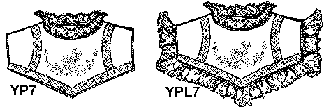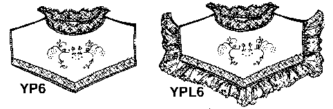 The simplest pointed yoke, shown as style YP1, is trimmed with entredeux. A lace ruffle can be added as shown in style YPL1.