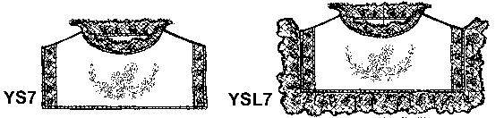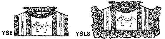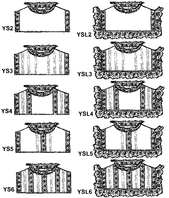 The yoke can be embellished with any combination of vertical rows of lace insertion, lace beading and pin tucks as shown in styles YS2 through YS6. Styles YSL2 through YSL6 provide the same embellishments with the addition of a lace ruffle edging.