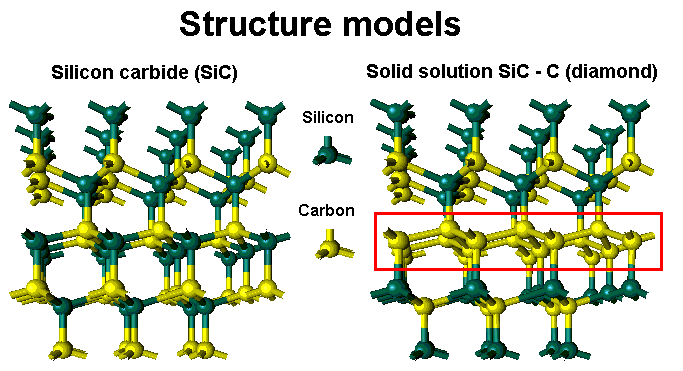 The red rectangle shows the difference between perfect crystal structure of silicon carbide (the left side of the picture) and SiC-C crystal structure (the right side of the picture). In the SiC structure the closest neiboring is at the same time in our SiC-C.